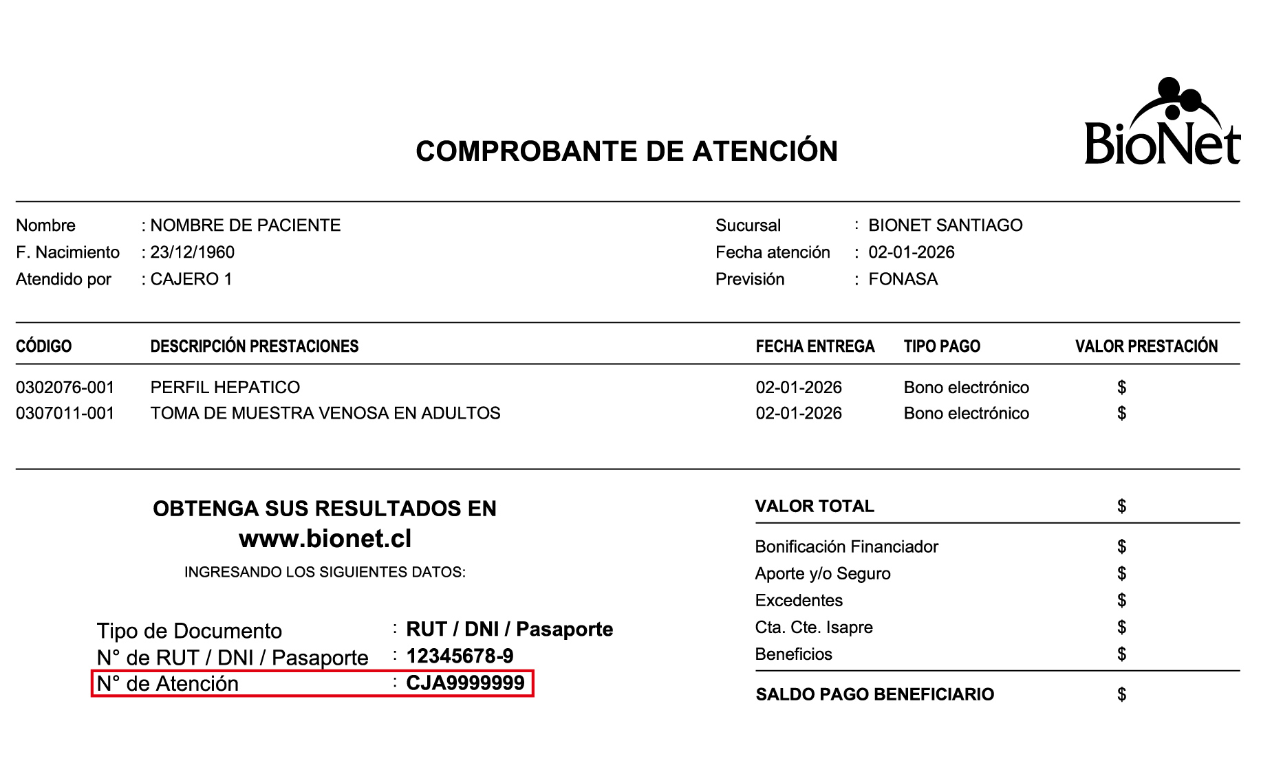 Los resultados sólo se podrán consultar con el RUT y número de atención del paciente, este último se entrega en el módulo de atención y luego de cancelar los exámenes. Este número es único y personal y es de responsabilidad del paciente mantenerlo en reserva.